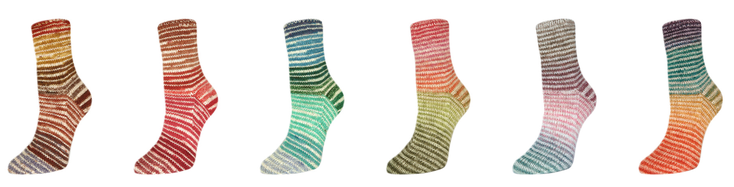 Der Farbverlauf erstreckt sich über 50 g, dann folgt ein auffälliger Trennfaden und im Anschluss noch einmal der komplette Farbverlauf. So entstehen zwei identische Socken.